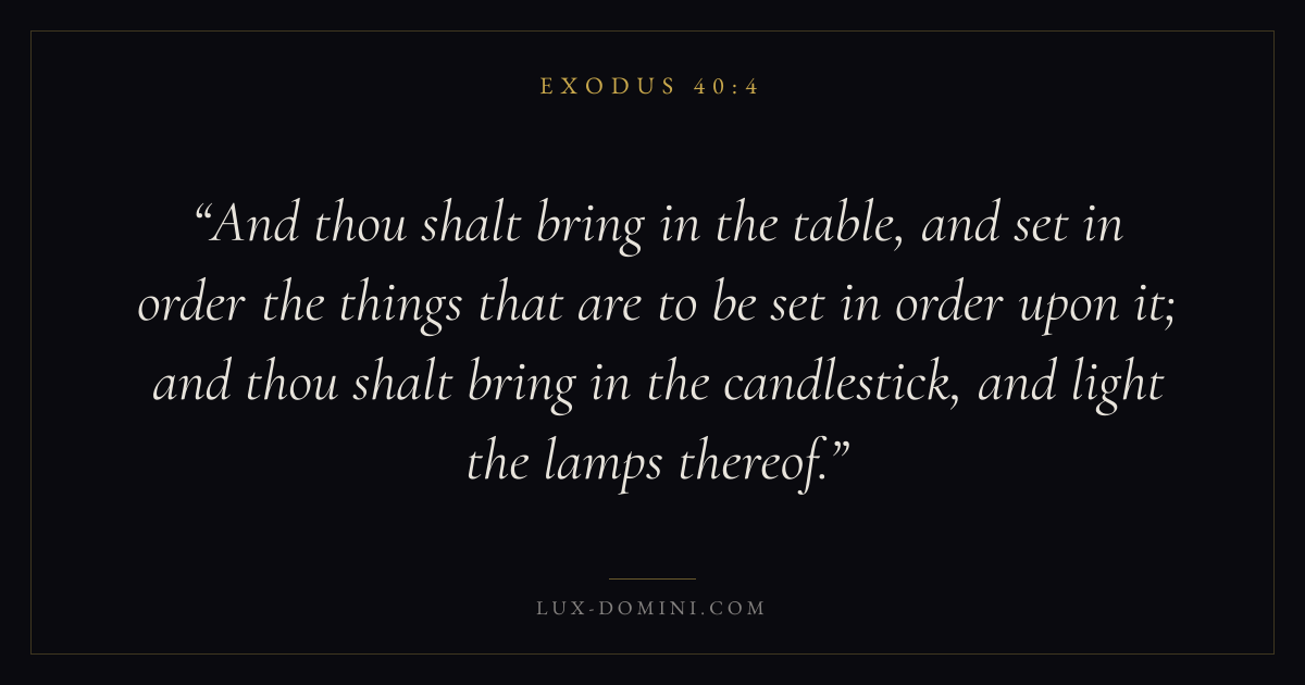 And thou shalt bring in the table, and set in order the things that are to be set in order upon it; and thou shalt bring in the candlestick, and light the lamps thereof.