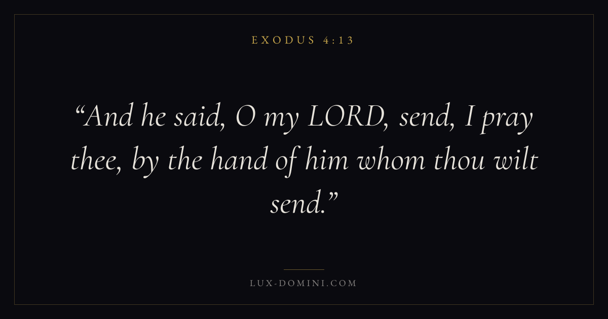 Books / Exodus / Chapter 4 / Verse 13 ← Exodus 4:12 Exodus 4:13 Exodus 4:14 → And he said, O my LORD, send, I pray thee, by the hand of him whom thou wilt send. Download verse card Share on Twitter Share on Facebook Pin it ✦ Key themes PrayerJustice and mercySalvationRedemption Read with Exodus 4:10Exodus 4:11Matthew 6:9Luke 18:1 Related topics Bible verses about prayerBible verses about justice and mercyBible verses about salvation ✦ Exodus Chapter 4 verses V. 1 V. 2 V. 3 V. 4 V. 5 V. 6 V. 7 V. 8 V. 9 V. 10 V. 11 V. 12 V. 13 V. 14 V. 15 V. 16 V. 17 V. 18 V. 19 V. 20 V. 21 V. 22 V. 23 V. 24 V. 25 V. 26 V. 27 V. 28 V. 29 V. 30 V. 31
