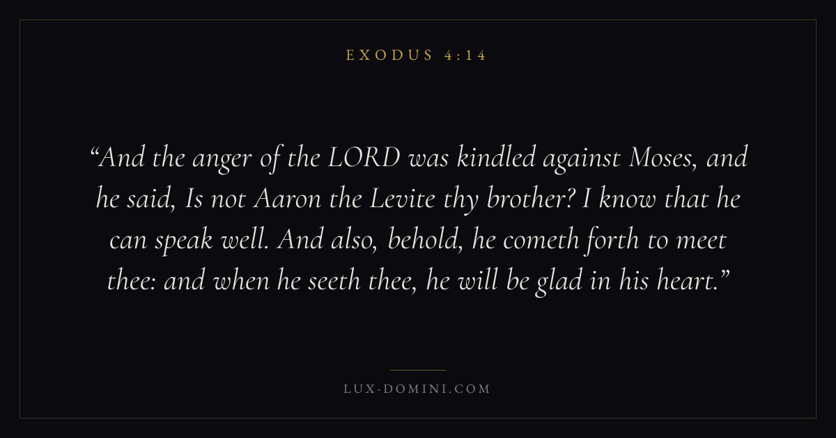 And the anger of the LORD was kindled against Moses, and he said, Is not Aaron the Levite thy brother? I know that he can speak well. And also, behold, he cometh forth to meet thee: and when he seeth thee, he will be glad in his heart.