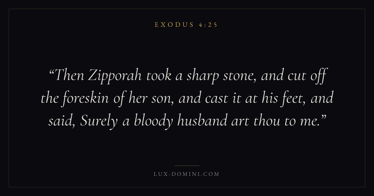 Then Zipporah took a sharp stone, and cut off the foreskin of her son, and cast it at his feet, and said, Surely a bloody husband art thou to me.