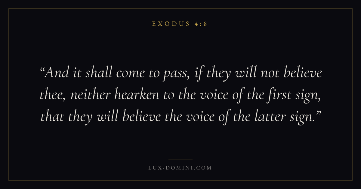 And it shall come to pass, if they will not believe thee, neither hearken to the voice of the first sign, that they will believe the voice of the latter sign.