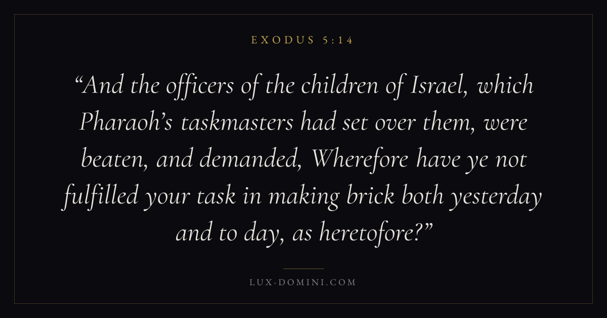 And the officers of the children of Israel, which Pharaoh’s taskmasters had set over them, were beaten, and demanded, Wherefore have ye not fulfilled your task in making brick both yesterday and to day, as heretofore?
