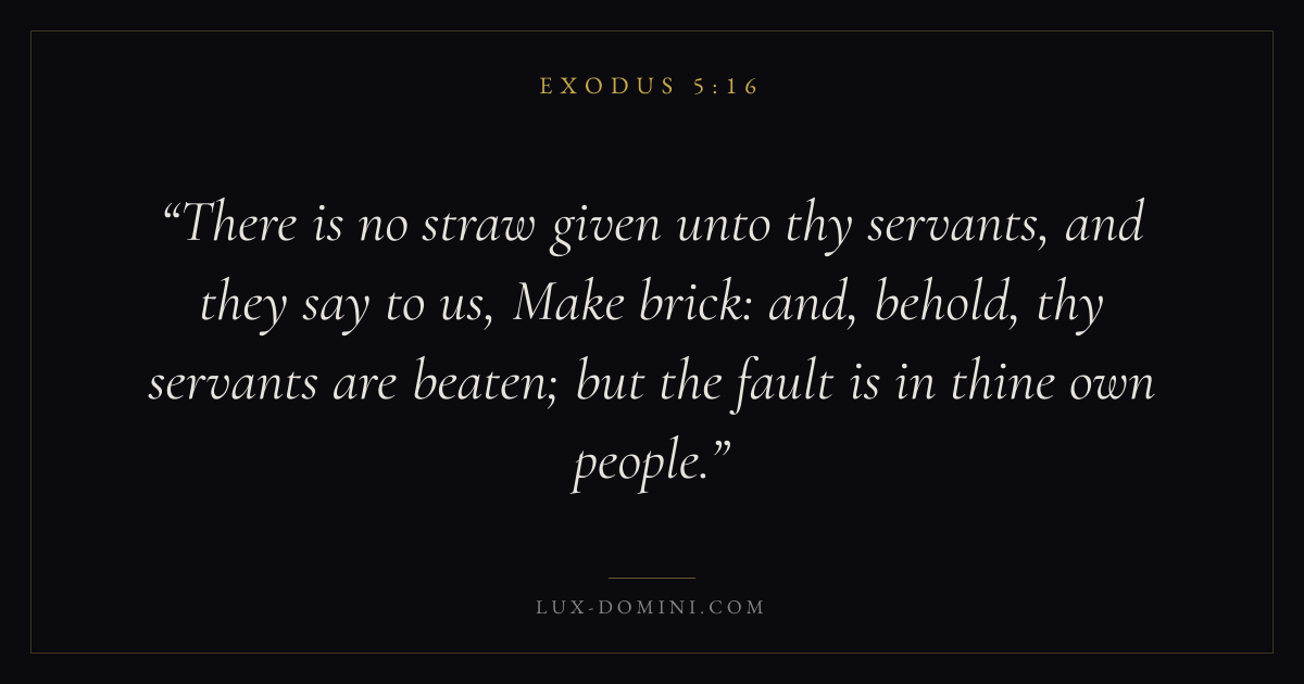 There is no straw given unto thy servants, and they say to us, Make brick: and, behold, thy servants are beaten; but the fault is in thine own people.