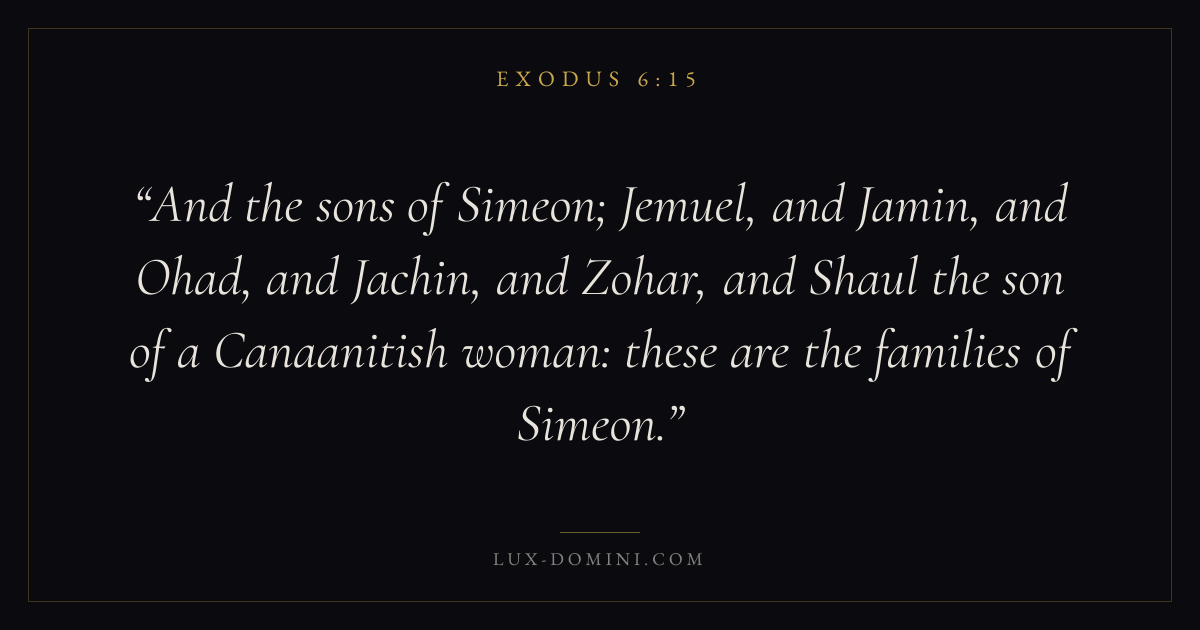 And the sons of Simeon; Jemuel, and Jamin, and Ohad, and Jachin, and Zohar, and Shaul the son of a Canaanitish woman: these are the families of Simeon.