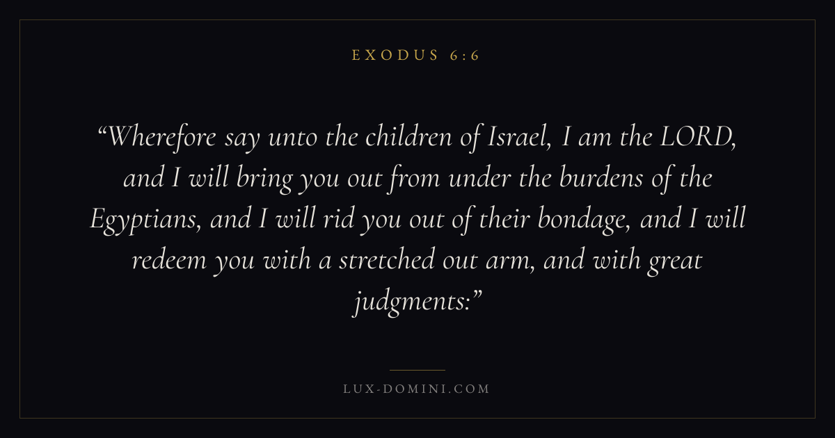 Wherefore say unto the children of Israel, I am the LORD, and I will bring you out from under the burdens of the Egyptians, and I will rid you out of their bondage, and I will redeem you with a stretched out arm, and with great judgments: