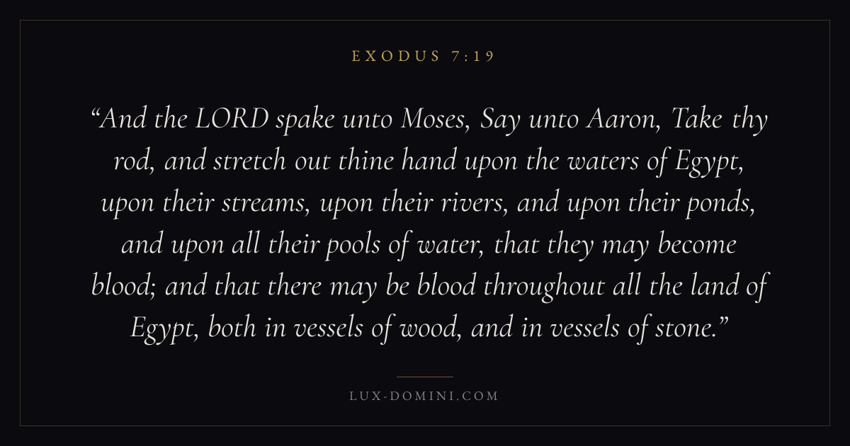 And the LORD spake unto Moses, Say unto Aaron, Take thy rod, and stretch out thine hand upon the waters of Egypt, upon their streams, upon their rivers, and upon their ponds, and upon all their pools of water, that they may become blood; and that there may be blood throughout all the land of Egypt, both in vessels of wood, and in vessels of stone.