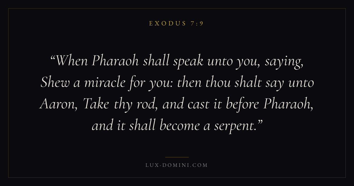 When Pharaoh shall speak unto you, saying, Shew a miracle for you: then thou shalt say unto Aaron, Take thy rod, and cast it before Pharaoh, and it shall become a serpent.