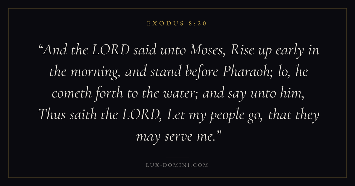 And the LORD said unto Moses, Rise up early in the morning, and stand before Pharaoh; lo, he cometh forth to the water; and say unto him, Thus saith the LORD, Let my people go, that they may serve me.