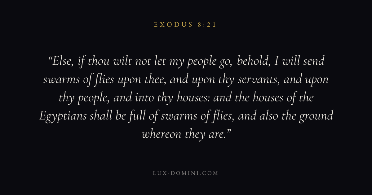 Else, if thou wilt not let my people go, behold, I will send swarms of flies upon thee, and upon thy servants, and upon thy people, and into thy houses: and the houses of the Egyptians shall be full of swarms of flies, and also the ground whereon they are.