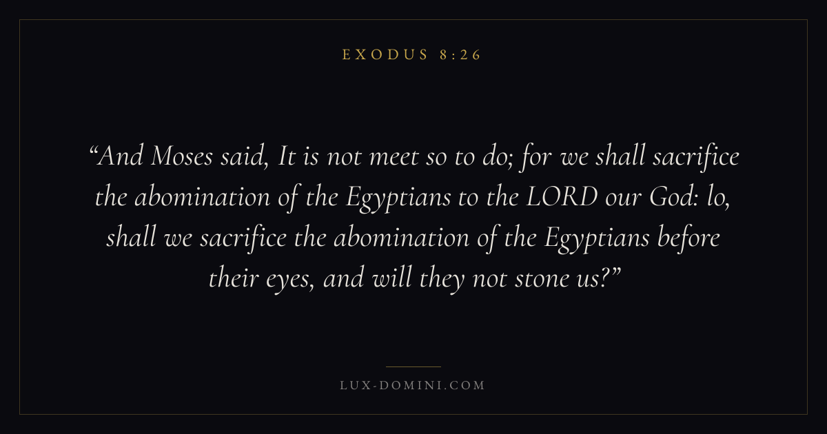 And Moses said, It is not meet so to do; for we shall sacrifice the abomination of the Egyptians to the LORD our God: lo, shall we sacrifice the abomination of the Egyptians before their eyes, and will they not stone us?