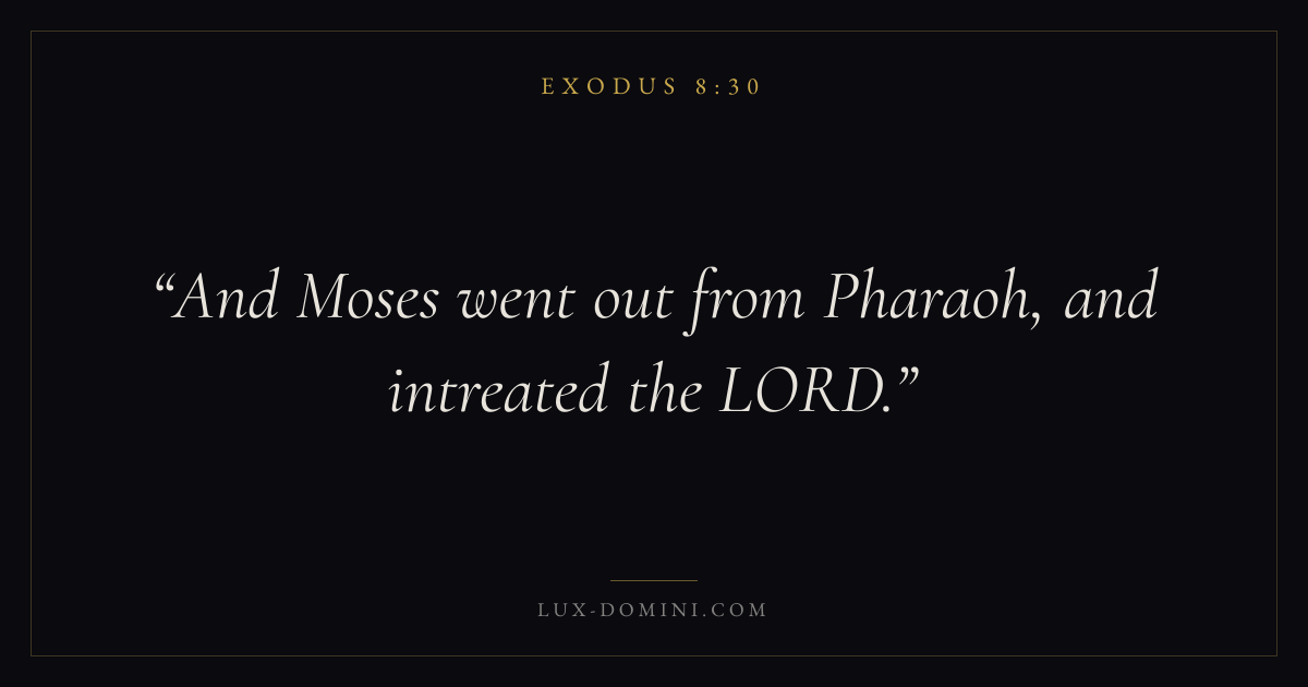 Books / Exodus / Chapter 8 / Verse 30 ← Exodus 8:29 Exodus 8:30 Exodus 8:31 → And Moses went out from Pharaoh, and intreated the LORD. Download verse card Share on Twitter Share on Facebook Pin it ✦ Key themes SalvationRedemptionPassoverCovenant Read with Exodus 8:27Exodus 8:28John 3:16Ephesians 2:8 Related topics Bible verses about salvation ✦ Exodus Chapter 8 verses V. 1 V. 2 V. 3 V. 4 V. 5 V. 6 V. 7 V. 8 V. 9 V. 10 V. 11 V. 12 V. 13 V. 14 V. 15 V. 16 V. 17 V. 18 V. 19 V. 20 V. 21 V. 22 V. 23 V. 24 V. 25 V. 26 V. 27 V. 28 V. 29 V. 30 V. 31 V. 32