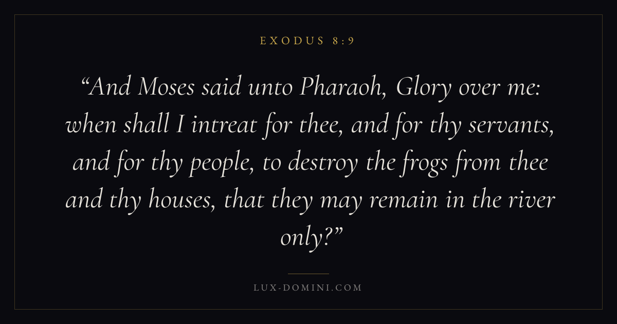 And Moses said unto Pharaoh, Glory over me: when shall I intreat for thee, and for thy servants, and for thy people, to destroy the frogs from thee and thy houses, that they may remain in the river only?