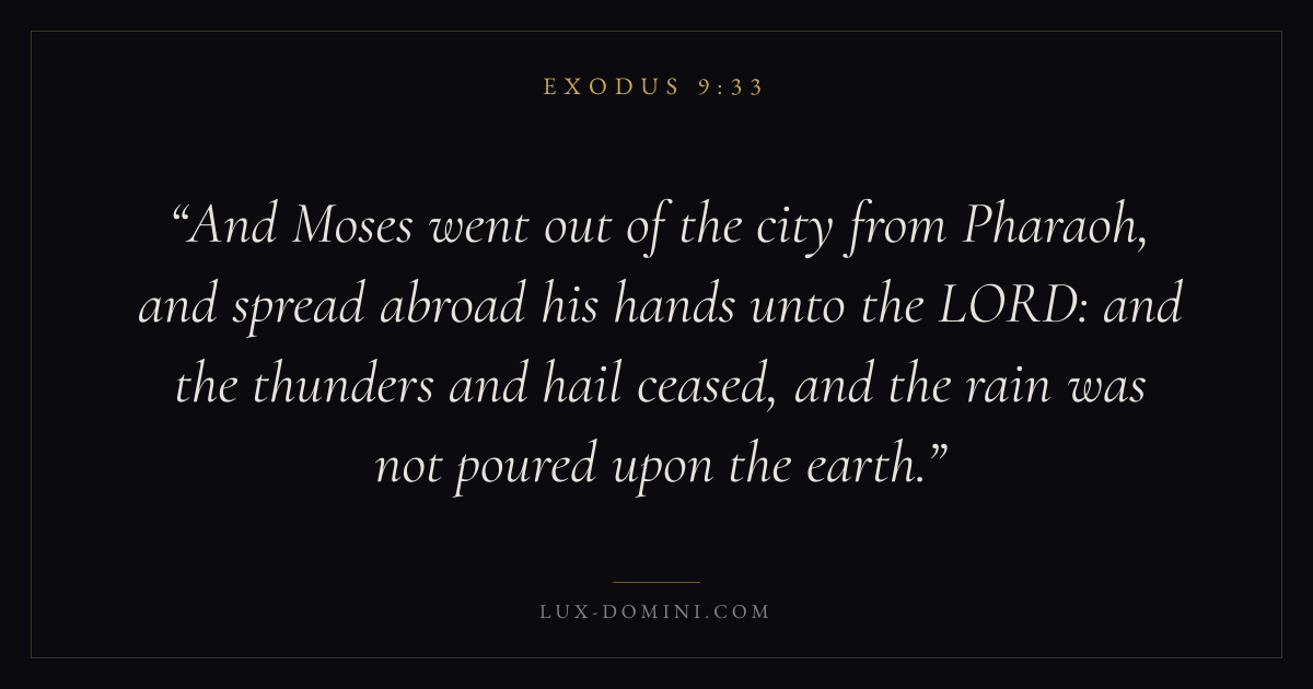 And Moses went out of the city from Pharaoh, and spread abroad his hands unto the LORD: and the thunders and hail ceased, and the rain was not poured upon the earth.