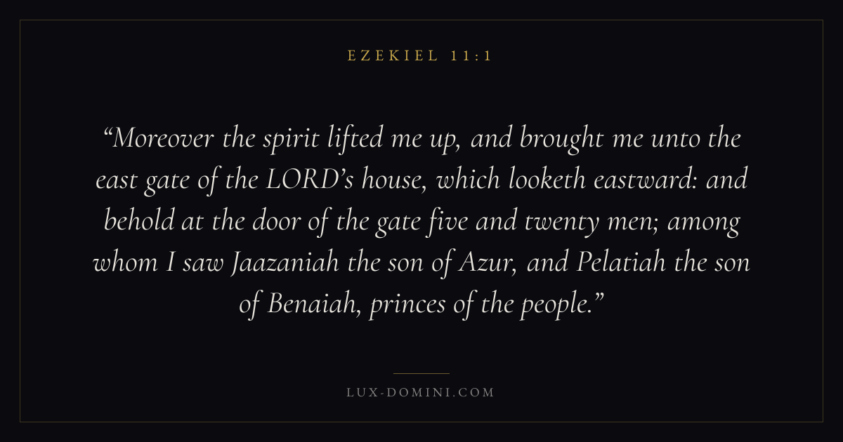 Moreover the spirit lifted me up, and brought me unto the east gate of the LORD’s house, which looketh eastward: and behold at the door of the gate five and twenty men; among whom I saw Jaazaniah the son of Azur, and Pelatiah the son of Benaiah, princes of the people.