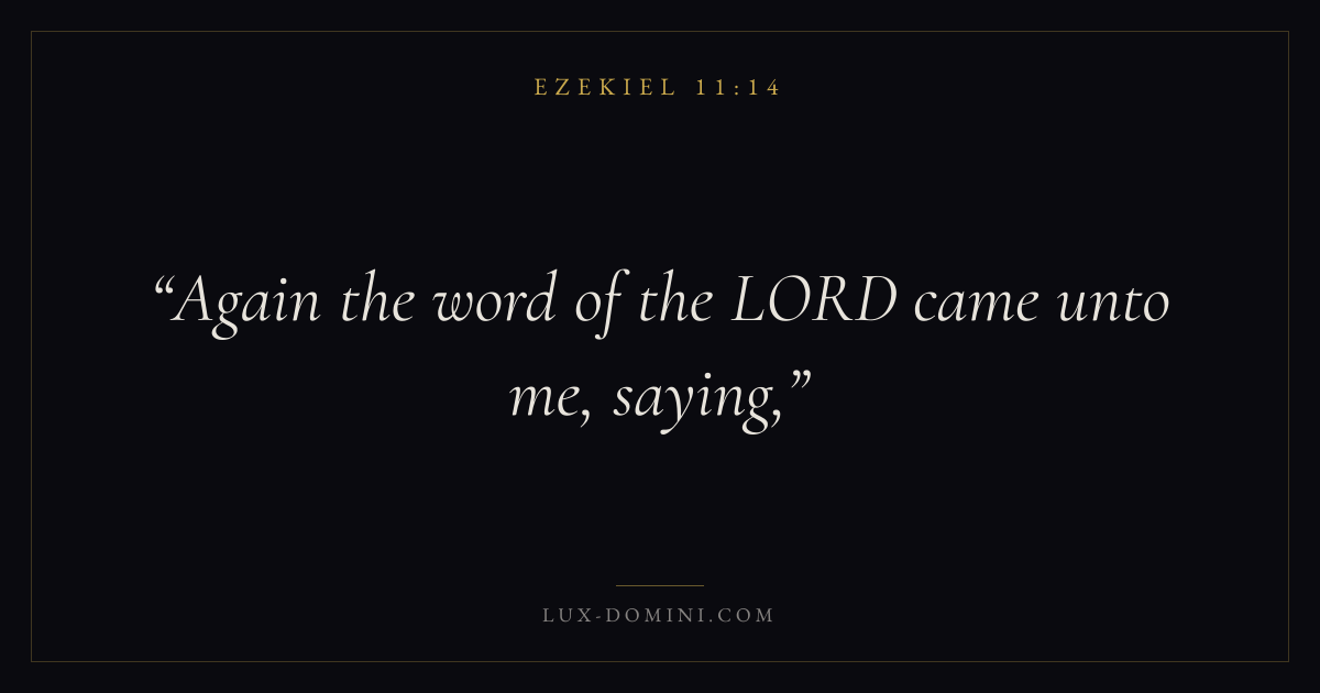 Books / Ezekiel / Chapter 11 / Verse 14 ← Ezekiel 11:13 Ezekiel 11:14 Ezekiel 11:15 → Again the word of the LORD came unto me, saying, Download verse card Share on Twitter Share on Facebook Pin it ✦ Key themes HopeJustice and mercyGraceTruthGlory of God Read with Ezekiel 11:15Ezekiel 11:16Romans 8:24Revelation 21:4 Related topics Bible verses about hopeBible verses about justice and mercyBible verses about graceBible verses about truth ✦ Ezekiel Chapter 11 verses V. 1 V. 2 V. 3 V. 4 V. 5 V. 6 V. 7 V. 8 V. 9 V. 10 V. 11 V. 12 V. 13 V. 14 V. 15 V. 16 V. 17 V. 18 V. 19 V. 20 V. 21 V. 22 V. 23 V. 24 V. 25