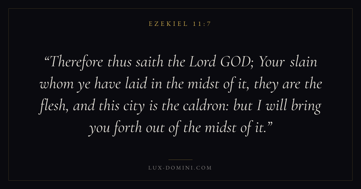 Therefore thus saith the Lord GOD; Your slain whom ye have laid in the midst of it, they are the flesh, and this city is the caldron: but I will bring you forth out of the midst of it.