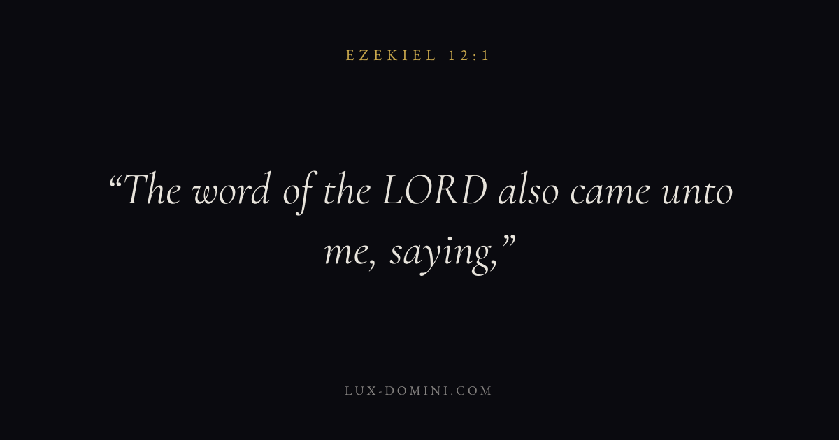 Books / Ezekiel / Chapter 12 / Verse 1 ← Ezekiel 11:25 Ezekiel 12:1 Ezekiel 12:2 → The word of the LORD also came unto me, saying, Download verse card Share on Twitter Share on Facebook Pin it ✦ Key themes Justice and mercyTruthGlory of GodJudgment Read with Ezekiel 12:2Ezekiel 12:3Micah 6:8Amos 5:24 Related topics Bible verses about justice and mercyBible verses about truth ✦ Ezekiel Chapter 12 verses V. 1 V. 2 V. 3 V. 4 V. 5 V. 6 V. 7 V. 8 V. 9 V. 10 V. 11 V. 12 V. 13 V. 14 V. 15 V. 16 V. 17 V. 18 V. 19 V. 20 V. 21 V. 22 V. 23 V. 24 V. 25 V. 26 V. 27 V. 28