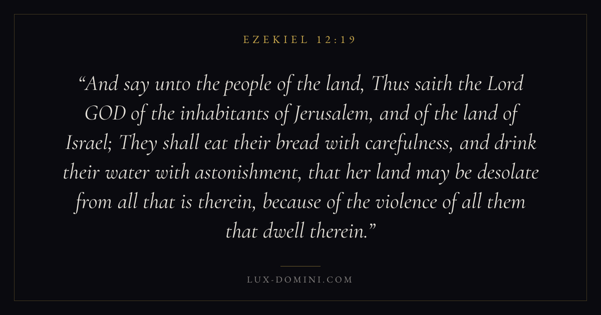 And say unto the people of the land, Thus saith the Lord GOD of the inhabitants of Jerusalem, and of the land of Israel; They shall eat their bread with carefulness, and drink their water with astonishment, that her land may be desolate from all that is therein, because of the violence of all them that dwell therein.