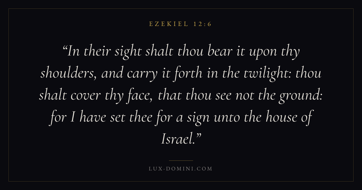 In their sight shalt thou bear it upon thy shoulders, and carry it forth in the twilight: thou shalt cover thy face, that thou see not the ground: for I have set thee for a sign unto the house of Israel.