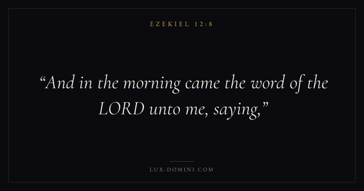 Books / Ezekiel / Chapter 12 / Verse 8 ← Ezekiel 12:7 Ezekiel 12:8 Ezekiel 12:9 → And in the morning came the word of the LORD unto me, saying, Download verse card Share on Twitter Share on Facebook Pin it ✦ Key themes Justice and mercyTruthGlory of GodJudgment Read with Ezekiel 12:9Ezekiel 12:10Micah 6:8Amos 5:24 Related topics Bible verses about justice and mercyBible verses about truth ✦ Ezekiel Chapter 12 verses V. 1 V. 2 V. 3 V. 4 V. 5 V. 6 V. 7 V. 8 V. 9 V. 10 V. 11 V. 12 V. 13 V. 14 V. 15 V. 16 V. 17 V. 18 V. 19 V. 20 V. 21 V. 22 V. 23 V. 24 V. 25 V. 26 V. 27 V. 28