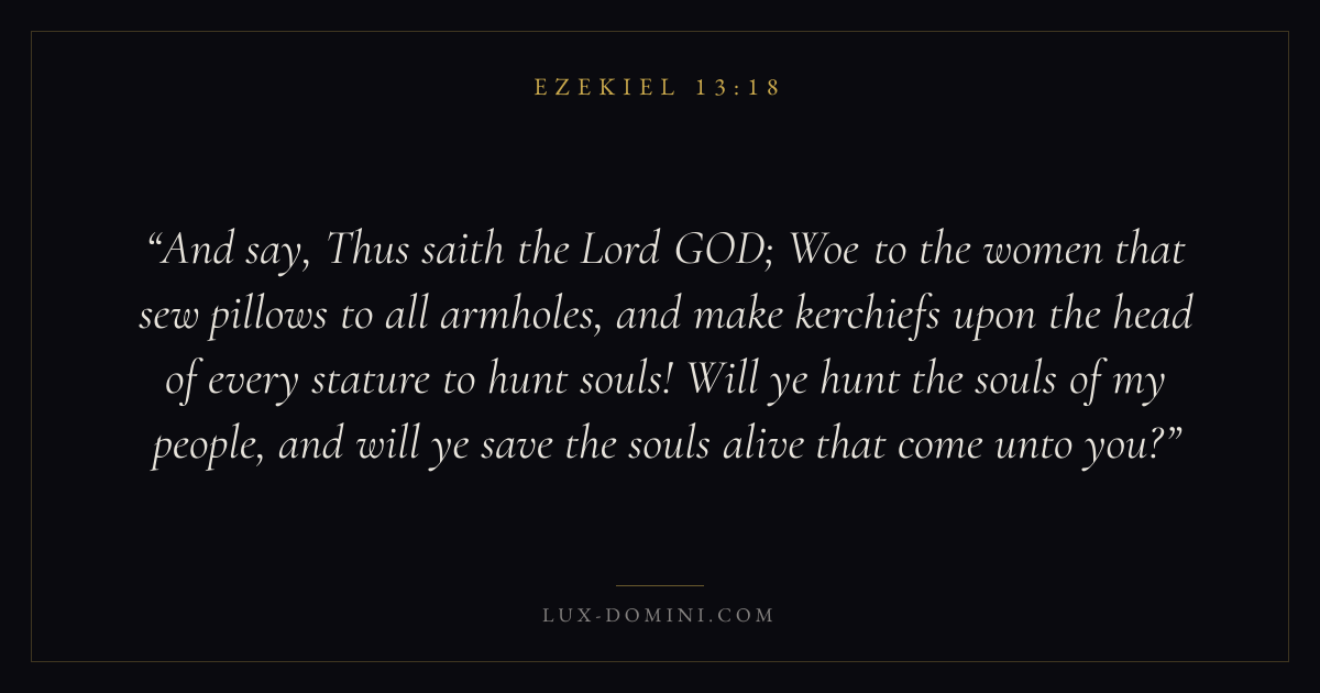 And say, Thus saith the Lord GOD; Woe to the women that sew pillows to all armholes, and make kerchiefs upon the head of every stature to hunt souls! Will ye hunt the souls of my people, and will ye save the souls alive that come unto you?