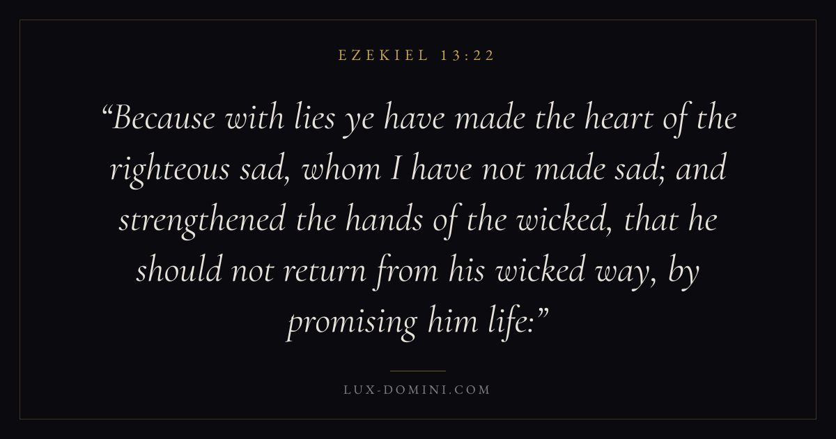 Because with lies ye have made the heart of the righteous sad, whom I have not made sad; and strengthened the hands of the wicked, that he should not return from his wicked way, by promising him life: