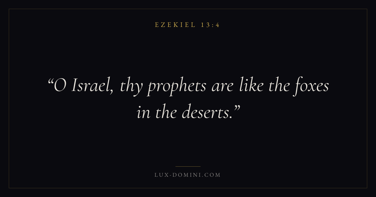 Books / Ezekiel / Chapter 13 / Verse 4 ← Ezekiel 13:3 Ezekiel 13:4 Ezekiel 13:5 → O Israel, thy prophets are like the foxes in the deserts. Download verse card Share on Twitter Share on Facebook Pin it ✦ Key themes WisdomJustice and mercyGlory of GodJudgment Read with Ezekiel 13:5Ezekiel 13:6Proverbs 1:7James 1:5 Related topics Bible verses about wisdomBible verses about justice and mercy ✦ Ezekiel Chapter 13 verses V. 1 V. 2 V. 3 V. 4 V. 5 V. 6 V. 7 V. 8 V. 9 V. 10 V. 11 V. 12 V. 13 V. 14 V. 15 V. 16 V. 17 V. 18 V. 19 V. 20 V. 21 V. 22 V. 23