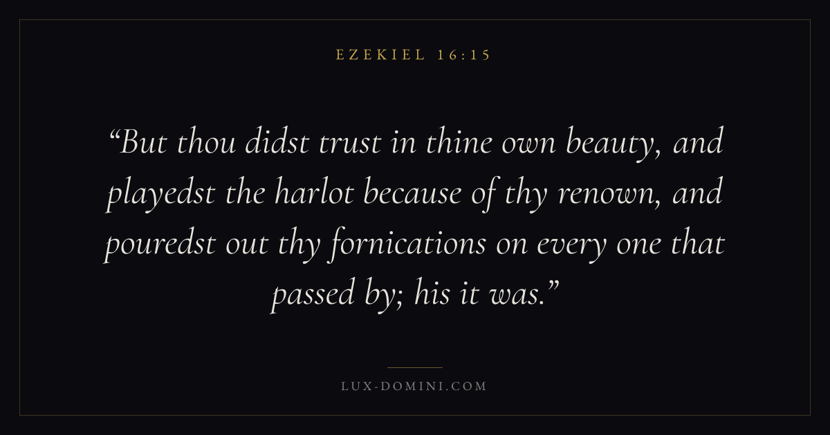 But thou didst trust in thine own beauty, and playedst the harlot because of thy renown, and pouredst out thy fornications on every one that passed by; his it was.
