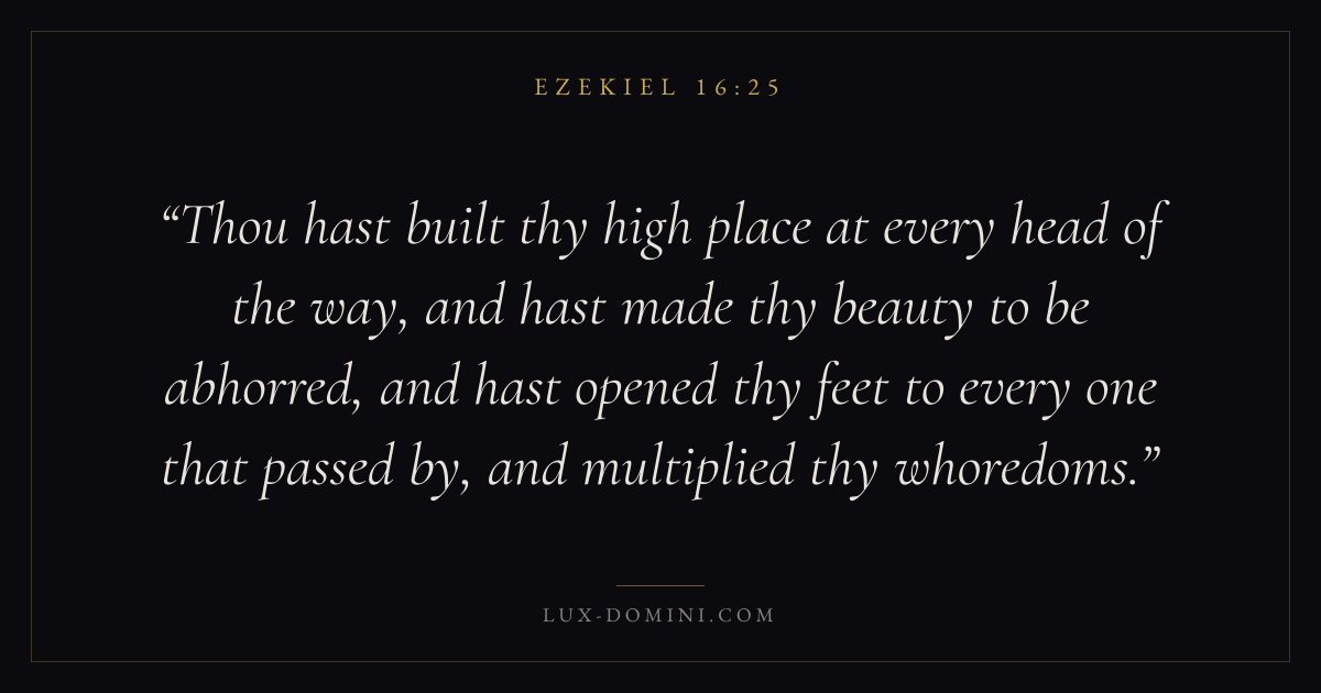 Thou hast built thy high place at every head of the way, and hast made thy beauty to be abhorred, and hast opened thy feet to every one that passed by, and multiplied thy whoredoms.