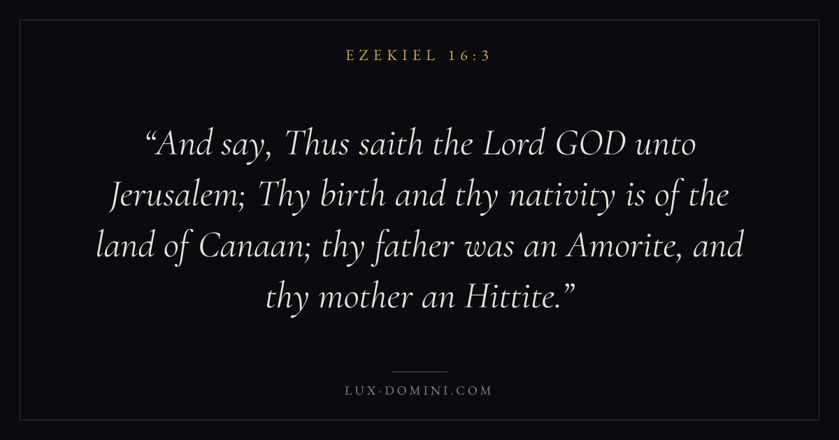And say, Thus saith the Lord GOD unto Jerusalem; Thy birth and thy nativity is of the land of Canaan; thy father was an Amorite, and thy mother an Hittite.