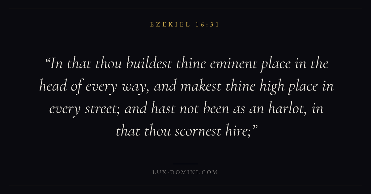In that thou buildest thine eminent place in the head of every way, and makest thine high place in every street; and hast not been as an harlot, in that thou scornest hire;