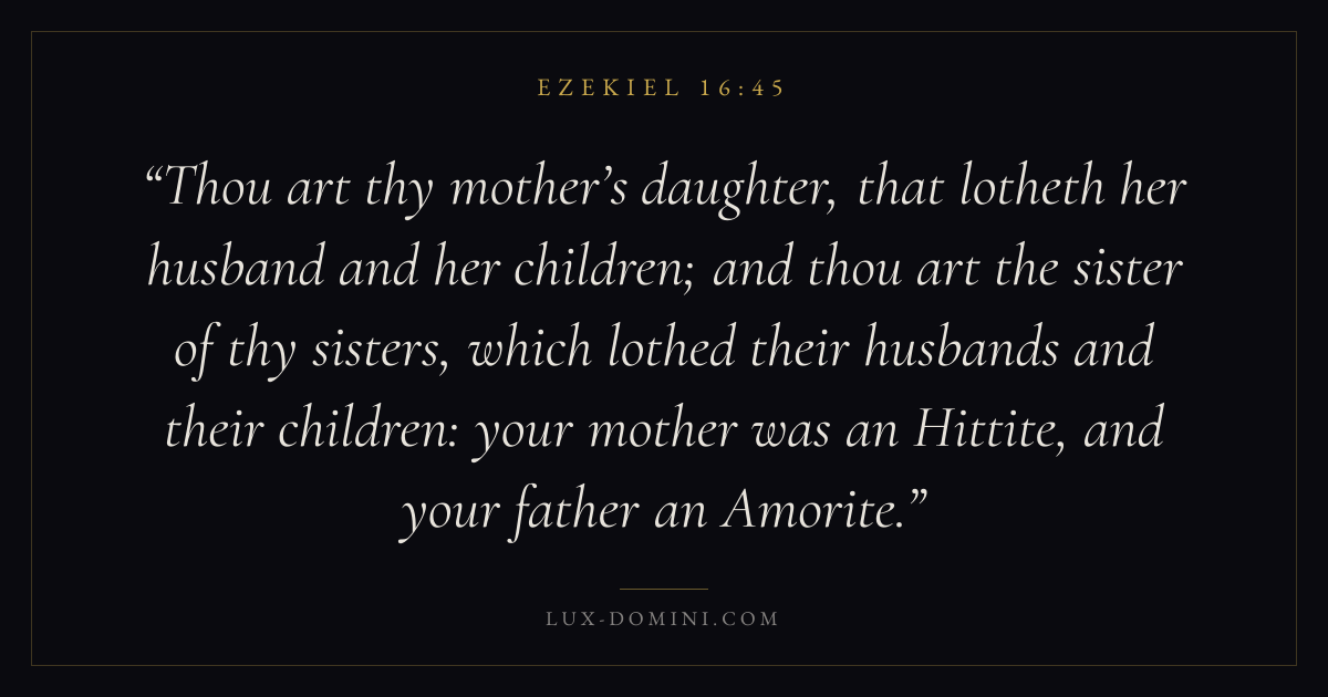 Thou art thy mother’s daughter, that lotheth her husband and her children; and thou art the sister of thy sisters, which lothed their husbands and their children: your mother was an Hittite, and your father an Amorite.