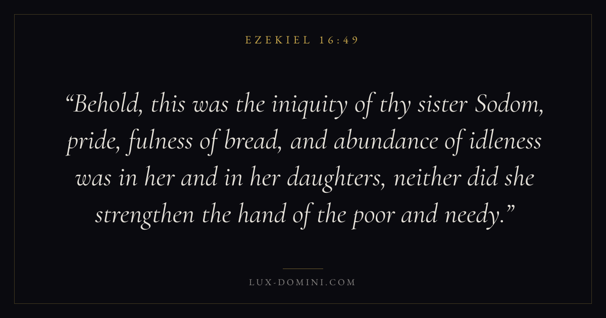 Behold, this was the iniquity of thy sister Sodom, pride, fulness of bread, and abundance of idleness was in her and in her daughters, neither did she strengthen the hand of the poor and needy.