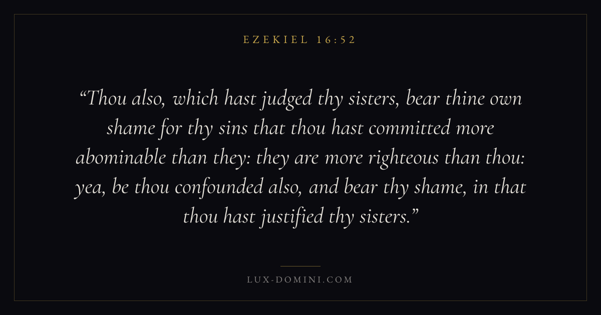 Thou also, which hast judged thy sisters, bear thine own shame for thy sins that thou hast committed more abominable than they: they are more righteous than thou: yea, be thou confounded also, and bear thy shame, in that thou hast justified thy sisters.