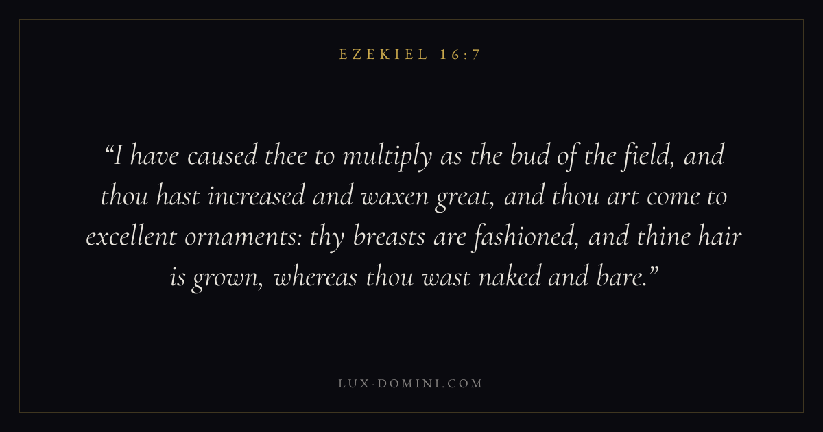 I have caused thee to multiply as the bud of the field, and thou hast increased and waxen great, and thou art come to excellent ornaments: thy breasts are fashioned, and thine hair is grown, whereas thou wast naked and bare.