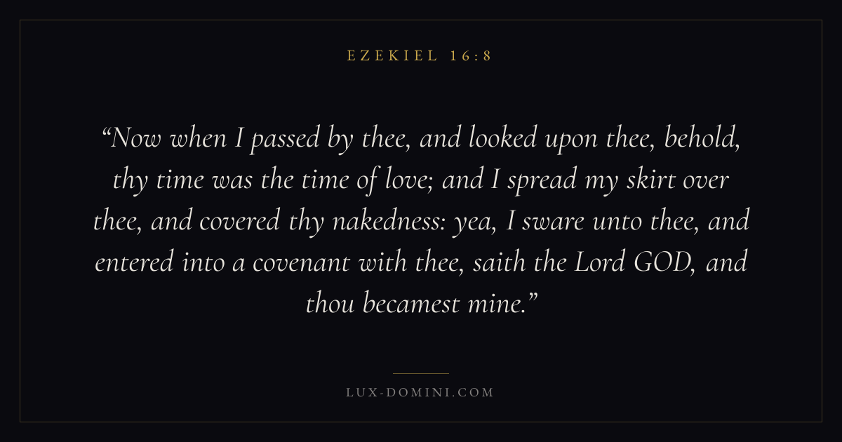 Now when I passed by thee, and looked upon thee, behold, thy time was the time of love; and I spread my skirt over thee, and covered thy nakedness: yea, I sware unto thee, and entered into a covenant with thee, saith the Lord GOD, and thou becamest mine.