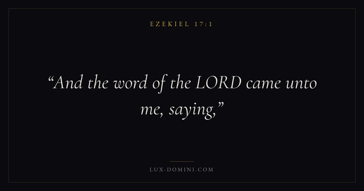 Books / Ezekiel / Chapter 17 / Verse 1 ← Ezekiel 16:63 Ezekiel 17:1 Ezekiel 17:2 → And the word of the LORD came unto me, saying, Download verse card Share on Twitter Share on Facebook Pin it ✦ Key themes Justice and mercyTruthGlory of GodJudgment Read with Ezekiel 17:2Ezekiel 17:3Micah 6:8Amos 5:24 Related topics Bible verses about justice and mercyBible verses about truth ✦ Ezekiel Chapter 17 verses V. 1 V. 2 V. 3 V. 4 V. 5 V. 6 V. 7 V. 8 V. 9 V. 10 V. 11 V. 12 V. 13 V. 14 V. 15 V. 16 V. 17 V. 18 V. 19 V. 20 V. 21 V. 22 V. 23 V. 24