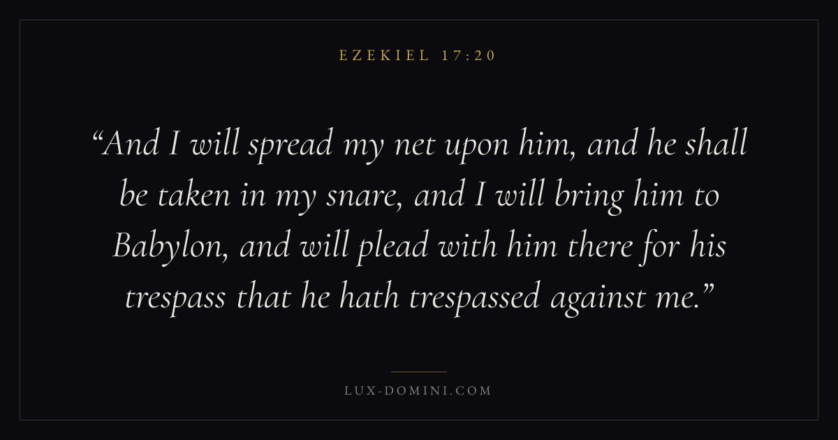 And I will spread my net upon him, and he shall be taken in my snare, and I will bring him to Babylon, and will plead with him there for his trespass that he hath trespassed against me.