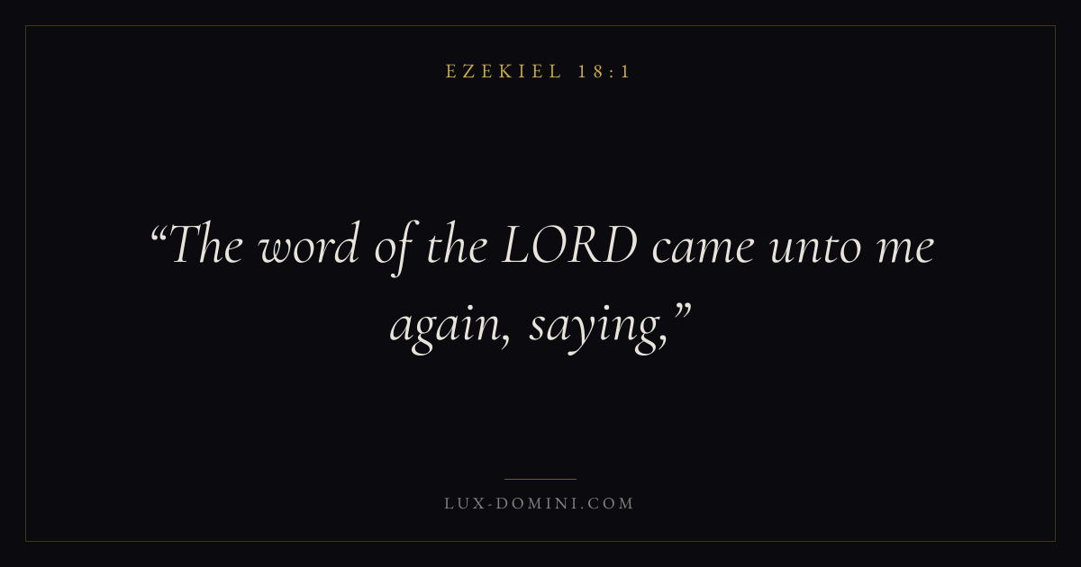 Books / Ezekiel / Chapter 18 / Verse 1 ← Ezekiel 17:24 Ezekiel 18:1 Ezekiel 18:2 → The word of the LORD came unto me again, saying, Download verse card Share on Twitter Share on Facebook Pin it ✦ Key themes Justice and mercyGraceTruthGlory of God Read with Ezekiel 18:2Ezekiel 18:3Micah 6:8Amos 5:24 Related topics Bible verses about justice and mercyBible verses about graceBible verses about truth ✦ Ezekiel Chapter 18 verses V. 1 V. 2 V. 3 V. 4 V. 5 V. 6 V. 7 V. 8 V. 9 V. 10 V. 11 V. 12 V. 13 V. 14 V. 15 V. 16 V. 17 V. 18 V. 19 V. 20 V. 21 V. 22 V. 23 V. 24 V. 25 V. 26 V. 27 V. 28 V. 29 V. 30 V. 31 V. 32