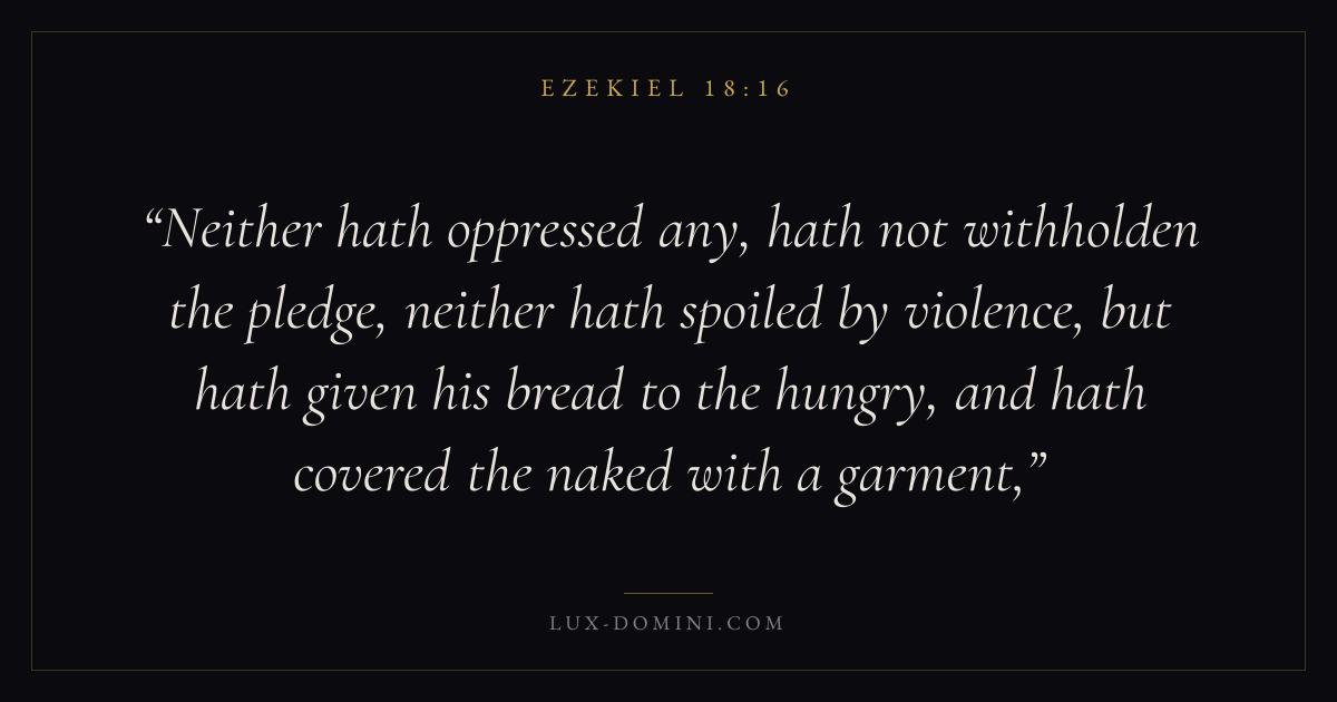 Neither hath oppressed any, hath not withholden the pledge, neither hath spoiled by violence, but hath given his bread to the hungry, and hath covered the naked with a garment,