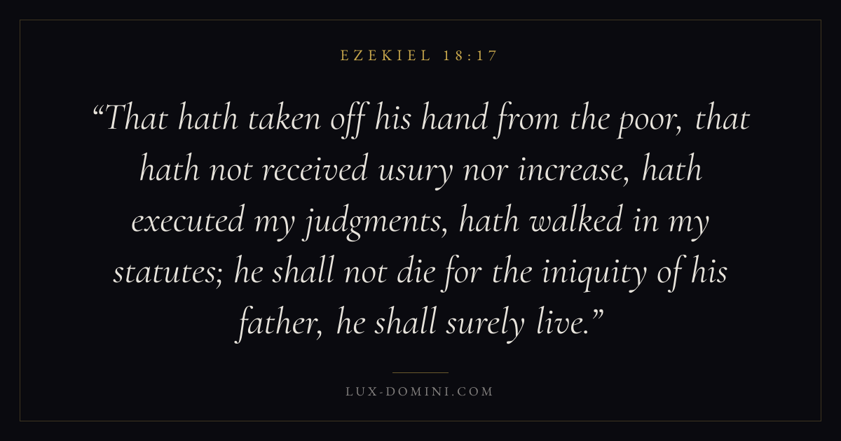 That hath taken off his hand from the poor, that hath not received usury nor increase, hath executed my judgments, hath walked in my statutes; he shall not die for the iniquity of his father, he shall surely live.