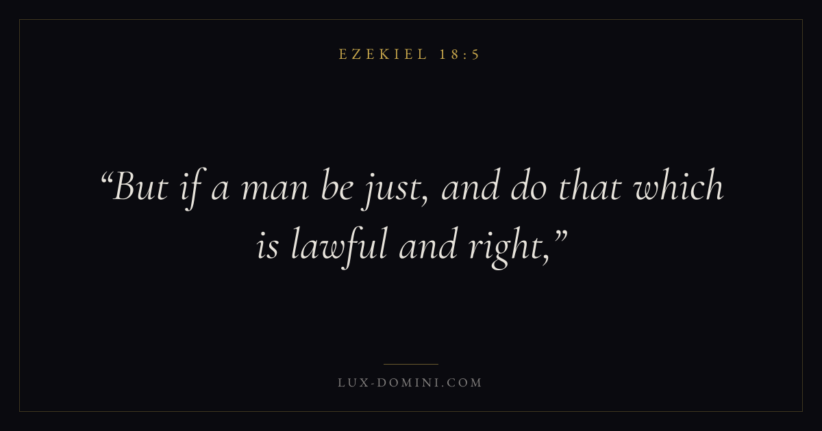 Books / Ezekiel / Chapter 18 / Verse 5 ← Ezekiel 18:4 Ezekiel 18:5 Ezekiel 18:6 → But if a man be just, and do that which is lawful and right, Download verse card Share on Twitter Share on Facebook Pin it ✦ Key themes Justice and mercyGraceGlory of GodJudgment Read with Ezekiel 18:6Ezekiel 18:7Micah 6:8Amos 5:24 Related topics Bible verses about justice and mercyBible verses about grace ✦ Ezekiel Chapter 18 verses V. 1 V. 2 V. 3 V. 4 V. 5 V. 6 V. 7 V. 8 V. 9 V. 10 V. 11 V. 12 V. 13 V. 14 V. 15 V. 16 V. 17 V. 18 V. 19 V. 20 V. 21 V. 22 V. 23 V. 24 V. 25 V. 26 V. 27 V. 28 V. 29 V. 30 V. 31 V. 32