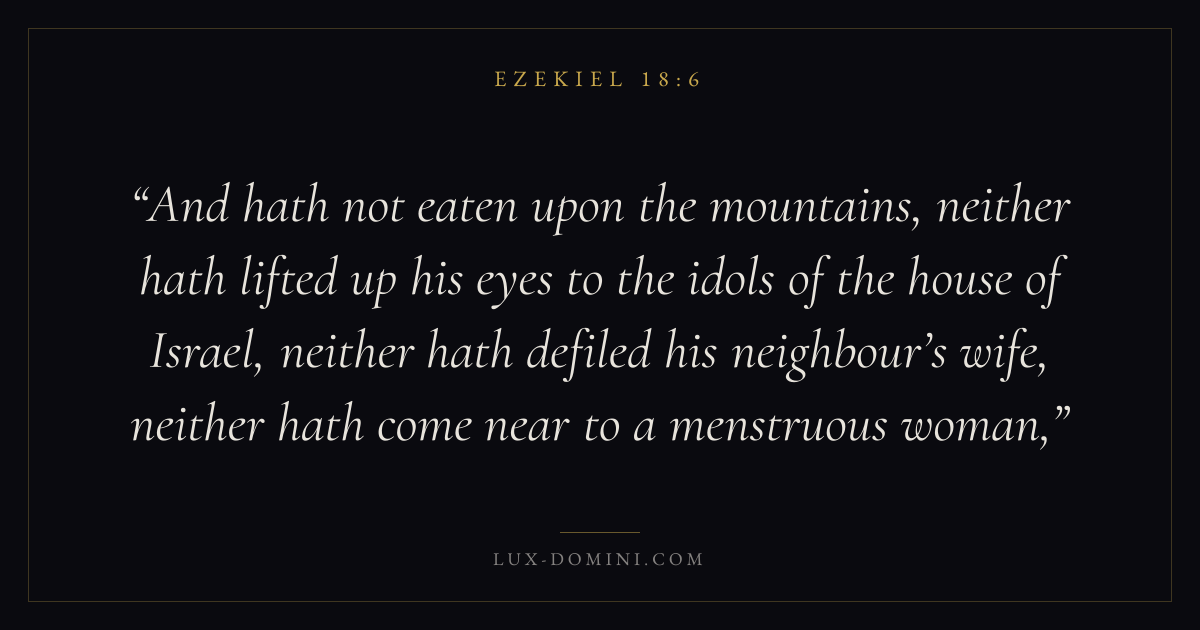 And hath not eaten upon the mountains, neither hath lifted up his eyes to the idols of the house of Israel, neither hath defiled his neighbour’s wife, neither hath come near to a menstruous woman,