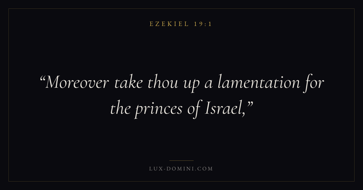 Books / Ezekiel / Chapter 19 / Verse 1 ← Ezekiel 18:32 Ezekiel 19:1 Ezekiel 19:2 → Moreover take thou up a lamentation for the princes of Israel, Download verse card Share on Twitter Share on Facebook Pin it ✦ Key themes Justice and mercyGlory of GodJudgmentExile Read with Ezekiel 19:2Ezekiel 19:3Micah 6:8Amos 5:24 Related topics Bible verses about justice and mercy ✦ Ezekiel Chapter 19 verses V. 1 V. 2 V. 3 V. 4 V. 5 V. 6 V. 7 V. 8 V. 9 V. 10 V. 11 V. 12 V. 13 V. 14