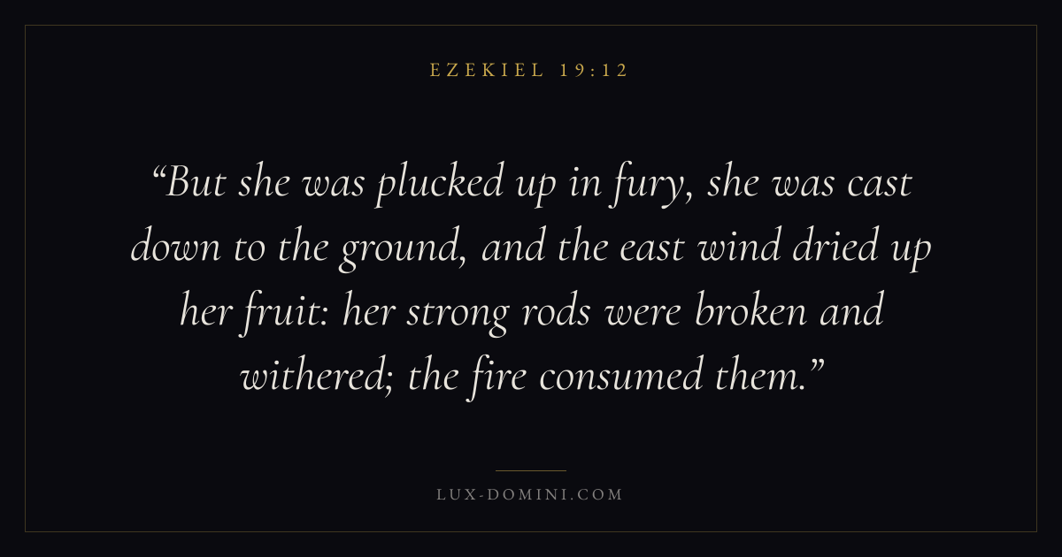 But she was plucked up in fury, she was cast down to the ground, and the east wind dried up her fruit: her strong rods were broken and withered; the fire consumed them.