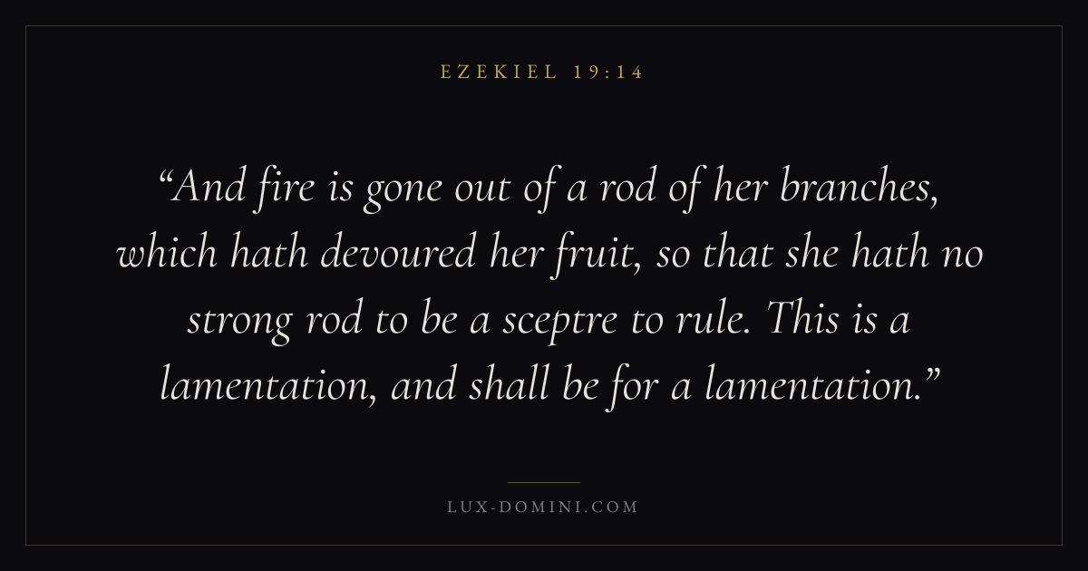 And fire is gone out of a rod of her branches, which hath devoured her fruit, so that she hath no strong rod to be a sceptre to rule. This is a lamentation, and shall be for a lamentation.