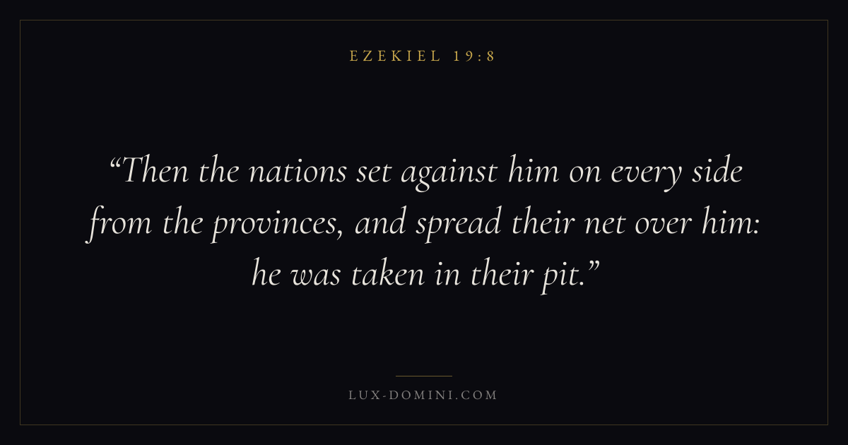 Then the nations set against him on every side from the provinces, and spread their net over him: he was taken in their pit.