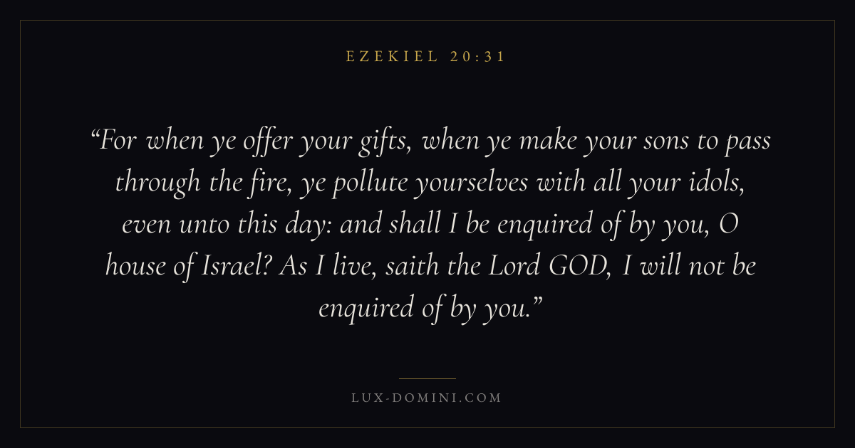 For when ye offer your gifts, when ye make your sons to pass through the fire, ye pollute yourselves with all your idols, even unto this day: and shall I be enquired of by you, O house of Israel? As I live, saith the Lord GOD, I will not be enquired of by you.
