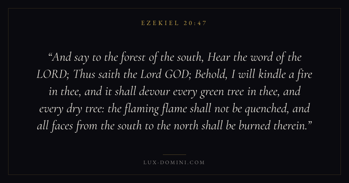 And say to the forest of the south, Hear the word of the LORD; Thus saith the Lord GOD; Behold, I will kindle a fire in thee, and it shall devour every green tree in thee, and every dry tree: the flaming flame shall not be quenched, and all faces from the south to the north shall be burned therein.
