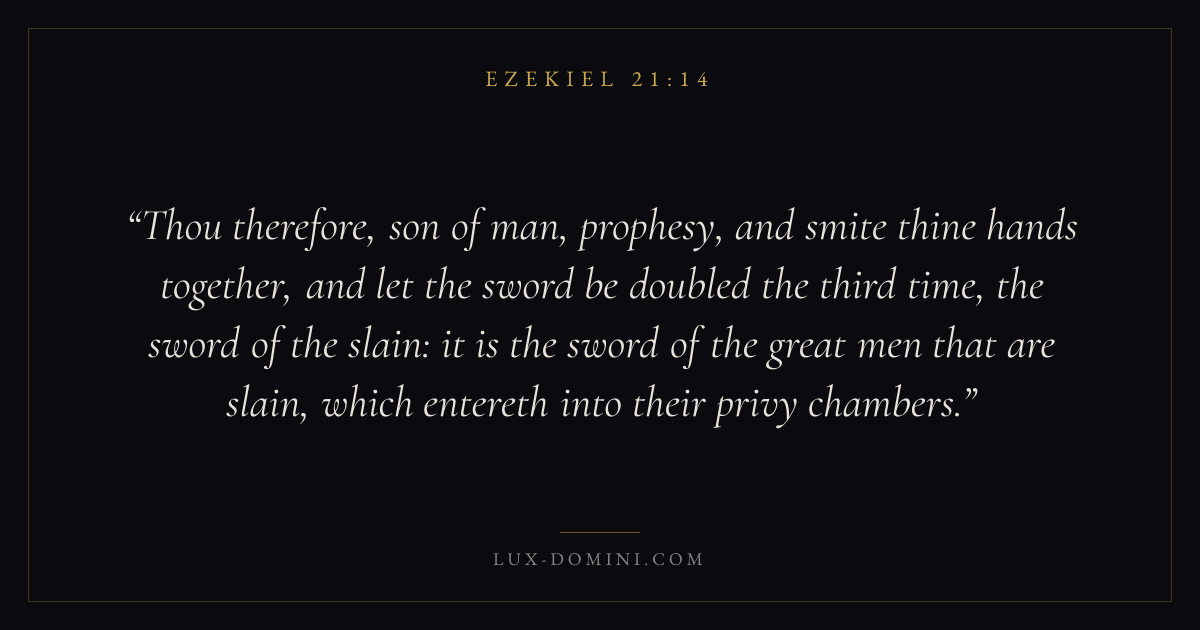 Thou therefore, son of man, prophesy, and smite thine hands together, and let the sword be doubled the third time, the sword of the slain: it is the sword of the great men that are slain, which entereth into their privy chambers.